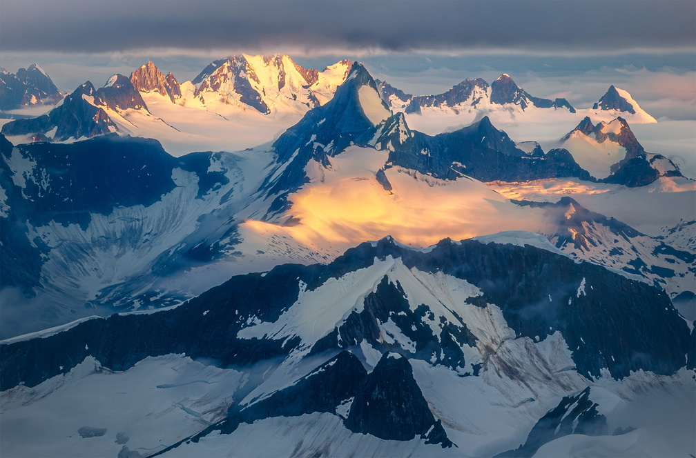 Sun peaking through a gap in the cloud cover over the Juneau Ice Field